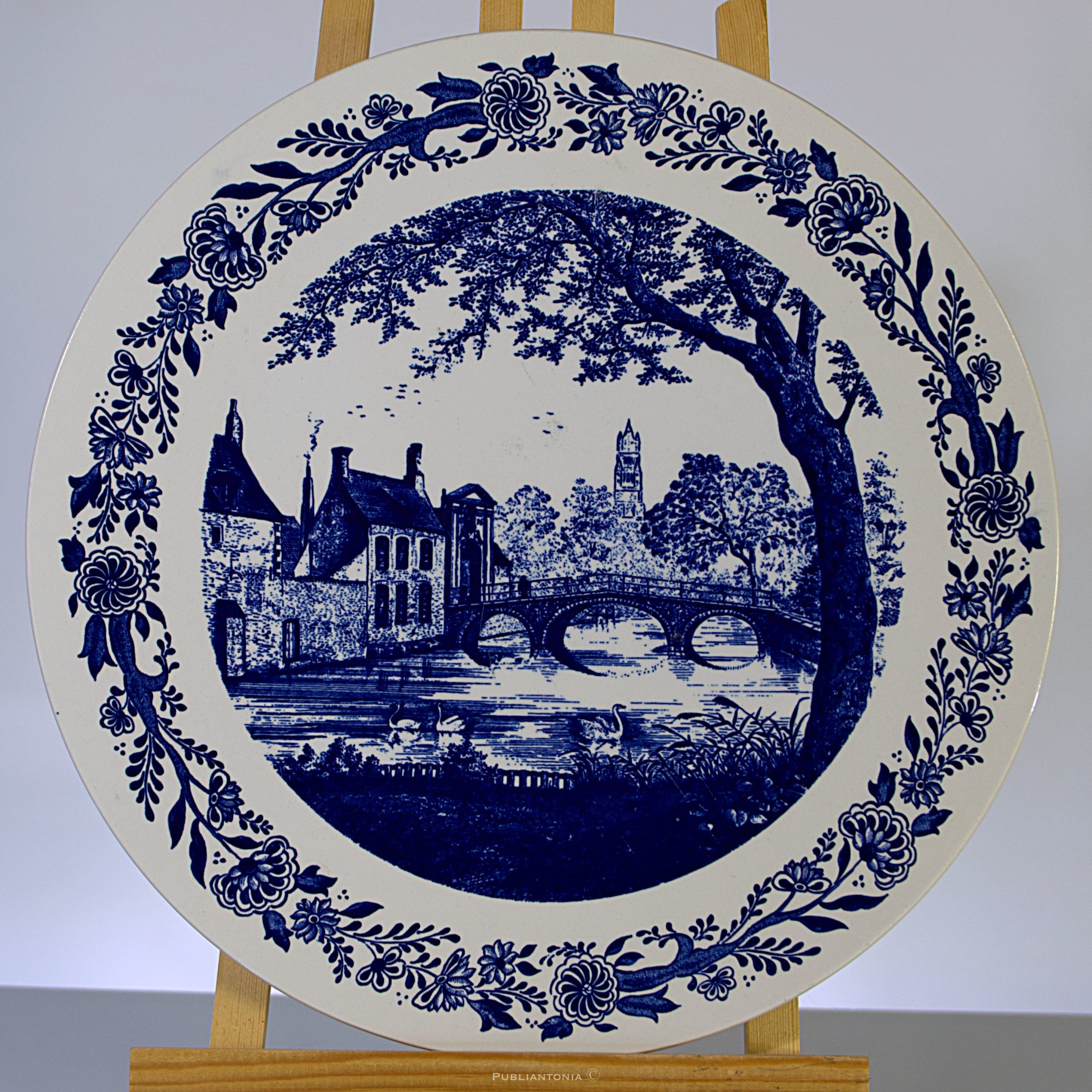 Son décor imprimé par transfert sous glaçure représente une charmante scène flamande : un canal pittoresque avec pont en pierre ancienne, maison traditionnelle, église en arrière-plan, cygnes glissant gracieusement sur l’eau et arbres évocateurs. La bordure florale en bleu cobalt, finement stylisée, encadre élégamment cette composition sur fond crème.